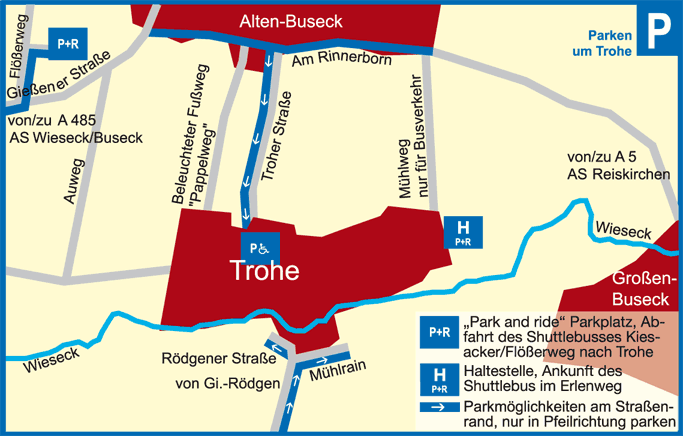 Parken an den Einfahrtstraßen aus/von Alten-Buseck und Rödgen: Sie können an diesen Einfahrtstraßen nach Trohe rechtsseitig parken. Gerne unterstützen Sie die Verkehrslenker beim Einparken. Behindertenparkplätze (mit Ausweis) stehen im Ort zur Verfügung.